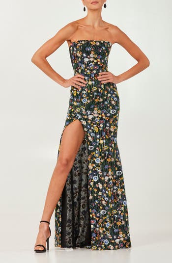 A glittering garden rushes across almost every inch of this deeply captivating gown designed to showcase your shoulders and flaunt lots of leg.