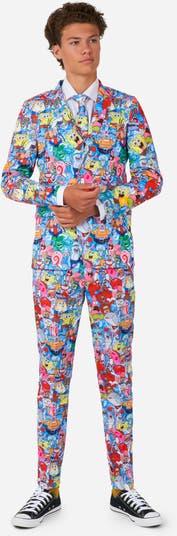 SpongeBob, Patrick, Squidward and the entire population of Bikini Bottom brighten a color-splashed suit guaranteed to make any kid easy to find on land or under the sea. It comes with a matching tie and pants that are not square but feature classic flat-front construction. When the party s over, everything washes easily in your machine so it s always ready for the next event.