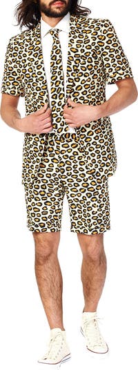 Put a fresh feline twist on your dressed-up summer style with this slim-fitting, leopard-spotted short suit. The short-sleeve two-button jacket, cuffed shorts and matching tie provide a dapper look that s perfect for cool cats who prefer to prowl in warm weather.