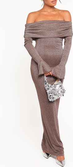 Twinkling metallic shimmer elevates this figure-sculpting maxi made in a shoulder-showing silhouette and topped with a dimension-creating neckline fold.