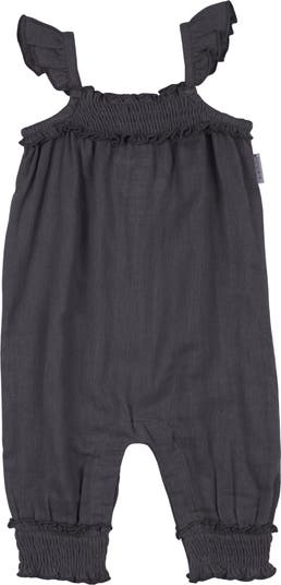 A smocked panel and fluttery ruffles lend undeniable charm to a sweet romper cut from lightweight organic cotton muslin your little one will love.