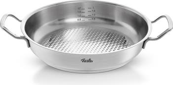 - SUPERIOR PERFORMANCE: Featuring the Fissler Novogrill surface, a waffled frying surface for perfect searing with minimal fat, our serving pan also includes extra-large pouring rims, ergonomic side handles, and interior measurement markings for precise cooking. Oven safe up to 450°F and dishwasher safe for easy maintenance, this pan ensures efficiency in every kitchen task.