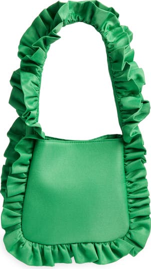 A dramatically ruffled perimeter brings delightful volume to this statement-making tote made from satin-finish twill with a water-resistant finish.