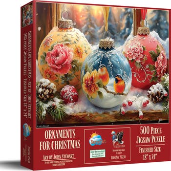 Ornaments for Christmas 500 pc Jigsaw Puzzle by SunsOut - 500 Piece Jigsaw Puzzle - Completed Size: 18" x 24" - Puzzle Artist: John Stewart - SunsOut Puzzles are Proudly Made in the USA - Interlocking Pieces and Durable Construction: SunsOut jigsaw puzzles feature interlocking pieces that fit securely, making assembly easier and reducing frustration. Made with high-quality recycled cardboard, they are durable and to easy to work with - Warranty: SunsOut puzzles being made in the USA ensures high manufacturing standards include a worry-free guarantee ensuring any issues with missing or damaged pieces are resolved, reflecting SunsOut s commitment to quality and customer service. - Eco-Friendly Materials: SunsOut puzzles are crafted with eco-friendly materials