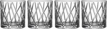 A textured diamond lattice adds contemporary, architectural style to a modern quartet of sparkling crystal bar glasses that won t slip in your hand.