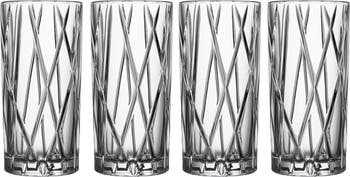 A textured diamond lattice adds contemporary, architectural style to a modern quartet of sparkling crystal highball glasses that won t slip in your hand.