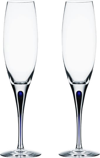 A stunning drop of color in the stem sets these champagne flutes apart from ordinary barware.