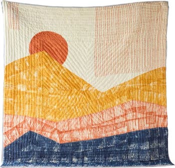 Introducing the Ouray Quilt, a mesmerizing reflection of the San Juan Mountains majesty. This quilt captivates with its abstract depiction of a sunset cascading over mountains in shades of yellow, orange, and midnight blue. Expertly handcrafted, each quilt marries the traditional arts of hand-block printing and Kantha stitching, performed by skilled artisans using 100% cotton. The quilt s reverse side features a minimalist design of a yellow circle complemented by blue stripes, offering a striking contrast and versatility in styling. Made with care and precision, the Ouray Quilt stands as a testament to both natural beauty and artisanal craftsmanship. The design is hand-pressed onto each quilt using hand-carved wooden blocks dipped in dyes. The printed cotton shells are brought to the homes of quiltmakers, who stuff and stitch the quilts by hand, creating the final product. Our quilts are made in small batches. Due to the handcrafted nature of this item, expect slight variations in the appearance of each unique piece.