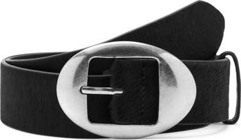 A distressed oval buckle adds distinctive style to this wide belt made from soft calf hair for eye-catching texture.
