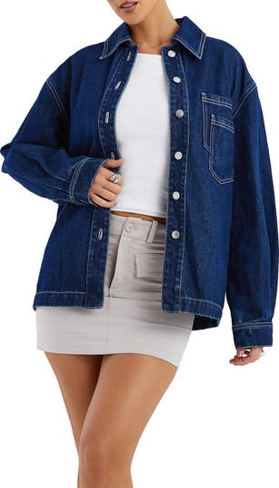 A dark-wash nonstretch-denim shirt is designed in an oversized silhouette with dropped shoulders and dual patch pockets on the left chest.