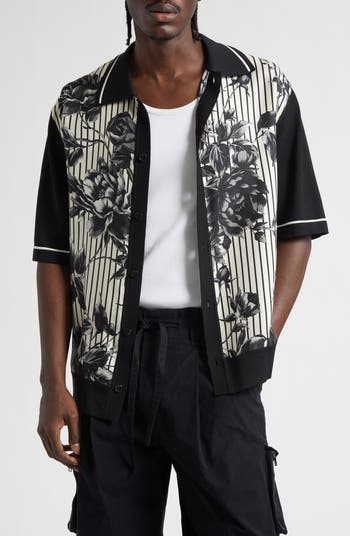 Refined yet casual, this shirt made of silk and cotton pairs a crisp twill front patterned in stripes and flowers with a solid black knit softening the sleeves and back. The oversize fit ensures you stay as relaxed and comfortable as you feel whether you wear it on its own or layered and unbuttoned.