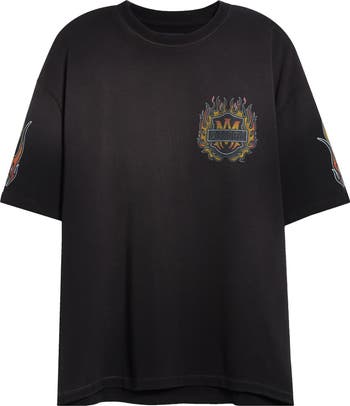 Cut from soft, breathable cotton, this crewneck T-shirt brings a flame-lit emblem to the chest and a full back hit that reads bold, edgy and ready for after dark.