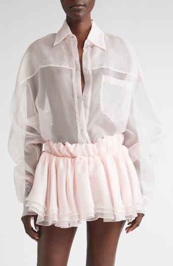 This button-up is provocative, modern and appeared to float down the spring 25 runway in an oversized fit cut from sheer silk organza in a blushing hue.