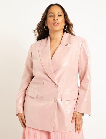 Fully lined Notch lapel Double breasted snap closure Two-piece sleeve Strong shoulder Hits below the hip Body length on size 18 is 34" Functional flap pockets Non-stretch sequin95% Polyester / 5% SpandexCare: Turn garment inside out. Hand wash cold with like colors. Only non-chlorine bleach when needed. Lay flat to dry. Cool iron as needed.