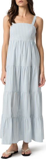 Crisp stripes sweeten this pristine cotton sundress cut in a breezy tiered silhouette with wide straps, an Empire waist and handy side pockets.