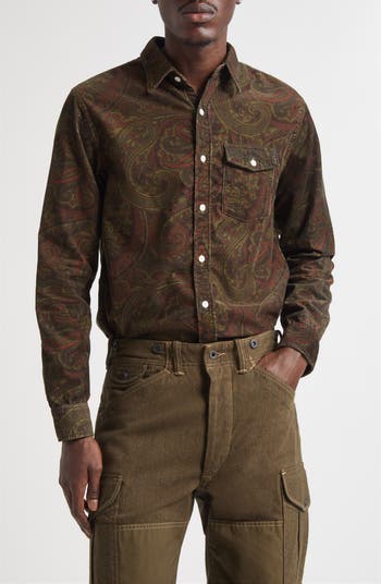 Rendered in fine-wale corduroy with a paisley print custom-developed by an esteemed Italian mill with more than a century of corduroy mastery, this relaxed workshirt brings heirloom texture to everyday rotation. Genuine mother-of-pearl buttons catch the light and the washed finish draws tonal dimension along the seams.