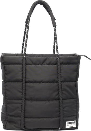 Contrasting elements and horizontal quilting highlight the recycled-nylon exterior of a spacious tote bag suspended from durable rope handles with padding at the shoulders.