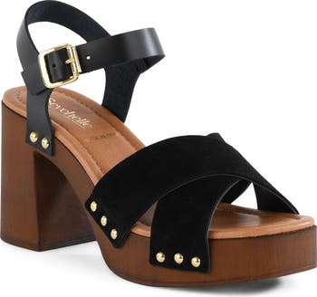 Polished studs highlight the wood-grain platform sole of this outfit-refining ankle-strap sandal.
