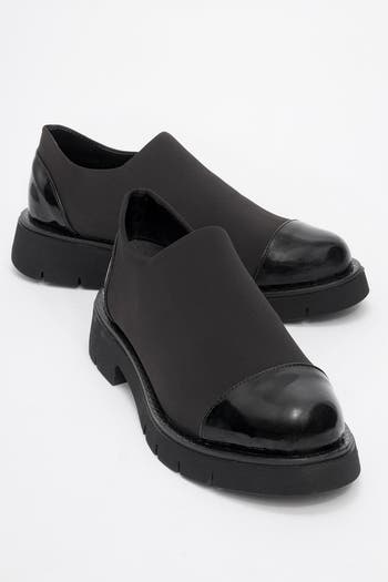 A versatile everyday shoe that blends glossy patent accents with flexible scuba fabric for all-day comfort