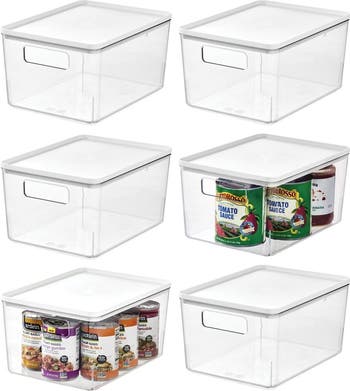 Bring order to any troubled kitchen area with our iDesign Set of 6 Pantry Bins. This versatile solution corrals snacks, boxed foods, and other food items you want to avoid losing to the back of the pantry. The easy, lift-off lid enables stackable storage to maximize space, turning overlooked and underutilized space into practical, space-saving storage. Designed with versatility in mind, each piece maximizes shelf space inside pantries, and the clear construction allows you to keep quick inventory without rummaging. With iDesign, you can live simply every day.