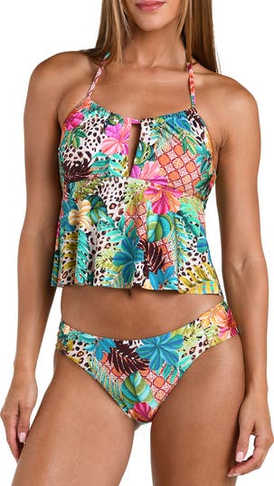 A cropped silhouette gives modern flair to this vibrant tankini top popped with glossy golden beads.