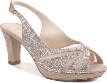 Sparkling jewel embellishments and peekaboo mesh insets amp up the glamorous appeal of a glitter-encrusted slingback pump framed by a peep toe and tapered heel.