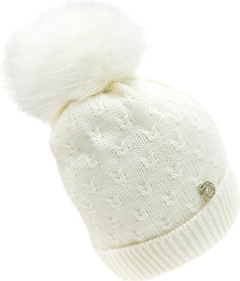 The ivory knit beanie has a stylish fold-over design and a playful pom on top, making it a fashionable choice for the cold weather season.