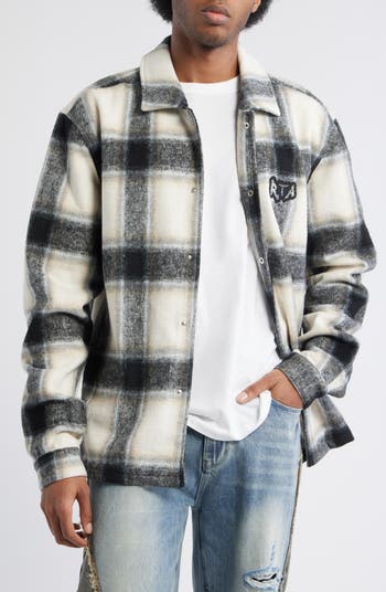 Circuit-board graphics in back bring a modern edge to this soft and cozy plaid shacket made in a relaxed fit for easy layering.