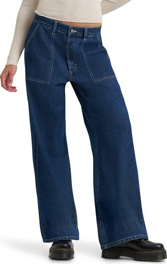 A hint of linen lightens the feel of these low-slung, oversized jeans made with utility pockets in front for even more 90s style.
