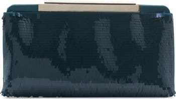 Row upon row of rectangular paillettes bring noteworthy shimmer to this frame clutch that s the epitome of quiet luxury.