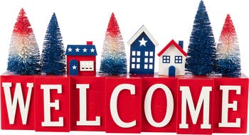 This 14"L patriotic table decor is a must-have for your space. It has bold red blocks spelling "WELCOME" in crisp white letters. Plus, there are adorable little houses and brush trees in red, white, and blue, perfect for adding a patriotic touch to your table, especially for holidays like the 4th of July.