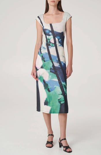 An abstract print steals the show on this figure-skimming midi that s kissed with comfortable stretch and framed by slight sleeves.