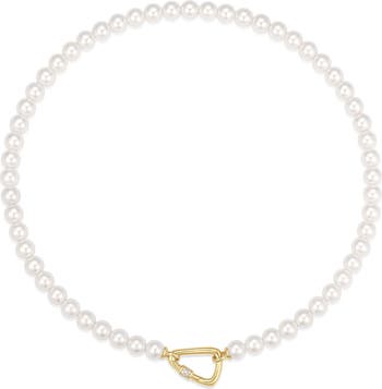 Timeless elegance and utility style combine on this faux-pearl necklace secured with a carabiner-inspired clasp illuminated with pavé crystals.