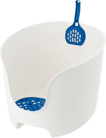 PAW TRAX HIGH WALL CAT LITTER BOX - WHITE BLUE - Keeps litter and spray inside, where it belongs. The surrounded high wall is designed to prevent spills and litter scatter, ensuring a cleaner and more contained environment for both you and your cat. Plus, the Anti-Tracking Grate Step helps to remove litter from paws as your cat comes and goes and keeps litter off the floor. From kittens to senior cats, the top opening gives them quick and easy access, while the wall provides privacy to do their business. A bottom recessed handle allows you to lift the litter box easily for cleaning and relocating. A scoop is included and can be hung on a hook inside the Litter Box for convenient storage. The sleek shape design was created instead of an unwanted traditional litter box look. Recommended for cats up to 17.6lbs.