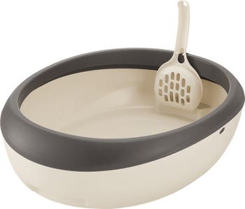 PAW TRAX Top Open Cat Litter Pan is ideal for cats who are difficult or uncomfortable using fully enclosed litter boxes. The top opening gives cats of all sizes quick and easy access. The top concave shield is to prevent litter scatter. Made of durable plastic makes it extremely easy to clean. A bottom recessed handle allows you to lift the litter pan easily for cleaning and relocating. Included is a scoop that can be hung on a hook inside the litter pan for convenient storage. The sleek shape design was created instead of an unwanted traditional litter box look.