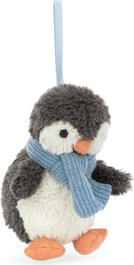Snuggly fur and a cozy scarf bring wintry cheer to a soft penguin that will add a friendly face to your tree this season.