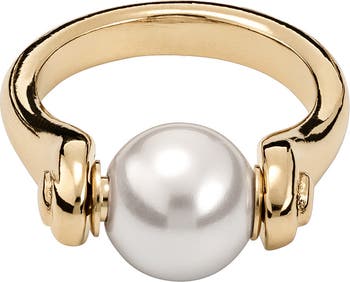18K gold-plated ring featuring a single small pearl placed at the center of a smooth open band.