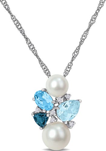 This pendant showcases blue topaz accompanied with cultured freshwater pearls and diamond accents, all set in 14k white gold on an 18-inch chain. The combination of sparkling topaz, lustrous pearls, and glittering diamonds creates a piece of unmatched beauty and sophistication. It s an ideal accessory for adding a touch of glamour to any outfit.