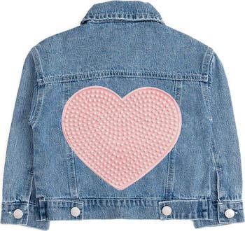 This denim jacket features a statement pink heart patch on the back adorned with delicate pearls for a touch of shine. A perfect layering piece that adds fun and flair to any outfit.