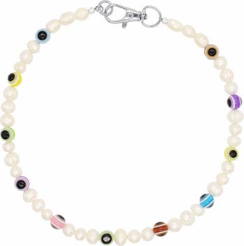 Pearl Necklace With Multicolor Evil Eye Beads designed to elevate everyday style. Designed and assembled in Los Angeles, this necklace combines natural freshwater pearls with colorful ceramic evil eye beads and stainless steel accents. Designed and assembled in Los Angeles from imported parts.