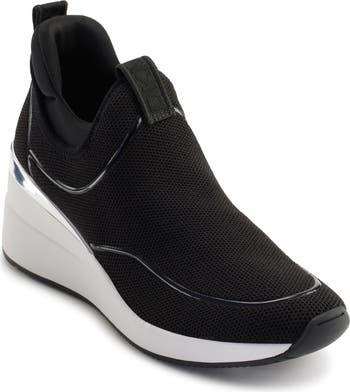 Metallic trim highlights the lofty wedge heel of this chic and sporty knit sneaker.