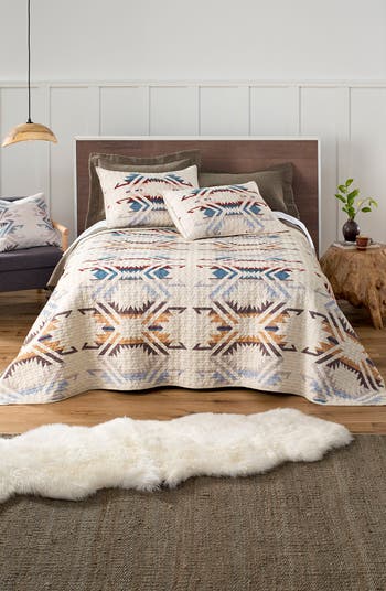 Intricate quilting and beautifully printed color mark this rustic quilt and sham set with warm, inviting character.