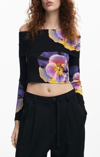 A foldover neckline highlights your shoulders in a trim, rib-knit crop top created in an eye-popping pansy print.