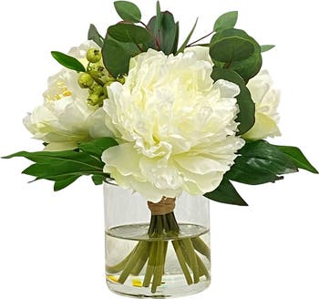 Our real faux peony eucalyptus arrangement showcases precisely designed peony blooms, with each petal exhibiting a lifelike texture and vibrant color. The eucalyptus leaves perfectly complement the peonies, creating a harmonious blend of floral and greenery.