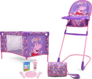 PEPPA PIG: AT HOME 8 PC SET - PURPLE, PINK, FLOWERS - The Peppa Pig At Home 8 Piece Set offers a collection of delightful accessories for imaginative play. Included in the set are a Doll Play Yard, Doll Highchair, Diaper/Changing Bag, and 5 Piece Feeding Accessories. The Peppa Pig Play Yard serves as a cozy bed for your child s baby doll or plush, featuring mesh sides for easy monitoring and space for multiple dolls. This versatile play yard is also travel-friendly, assembling and packing into a compact size for sleepovers or trips. The Peppa Pig Feeding Highchair boasts a sturdy steel tube base and a colorful seat that comfortably accommodates dolls ranging from 12 to 18 inches. The set s feeding accessories, including a plate, fork, spoon, feeding bottle, and food box, add to the realism of nurturing play. The included diaper/handbag allows for easy transport of accessories on the go and ensures that feeding time remains enjoyable with easy-to-clean materials. With this At Home 8 Piece Set, little parents can engage in a perfect blend of fantasy and real parent role-play with their favorite dolls and plush characters. INCLUDES: Doll Play Pen, Doll Highchair, Handbag and 5 Piece Feeding Accessories. PRODUCT DIMENSIONS: Play Yard: 16.9 (L) x 10.8 (W) x 11 (H) inches. Highchair: 11.2 (L) : 15.1 (W) x 26.3 (H) inches. Suitable for dolls up to 18 inches (46 cm). **Doll Not Included.** Officially Licensed Peppa Pig doll accessory. Suitable for girls boys ages 3 and up.