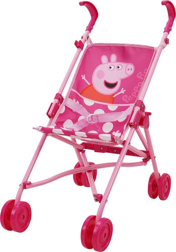 Peppa Pig Doll Umbrella Stroller made with Steel tube frame, easy to fold for storage and / or travel. The stroller seat has an adjustable seat belt to keep your favorite doll or stuffed animal safe and secure. The stroller’s fun bright fabric with Peppa Pig Pattern is a durable polyester which can be hand washed. The stroller can be easily folded for storage and on transportation - take it everywhere! This Peppa Pig Doll Stroller also includes a safety lock system that prevents a sudden or unexpected collapse, both side safety latches must be lifted in order to fold for storage or travel. The Umbrella Stroller will bring endless amounts of fun and fantasy play for little mommies and daddies around the Globe! Perfect blend of fantasy and real parent role-play. Children will love the fun colorful pink and white pattern featuring Peppa Pig. Product Dimension: 18.5 x 10.83 x 21.46 inches. Fits dolls up to 24" (60cm). ***Doll not included.*** This product is made for kids 3 years and up.