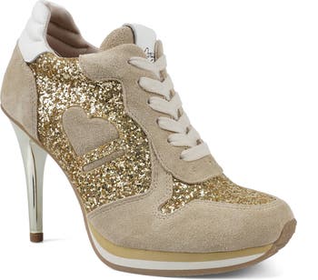 Suede overlays amplify the sporty-chic style of this lace-up pump set on a lofty stiletto heel.