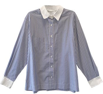 - 100% Cotton, contrast white cuff and collar, dry clean only