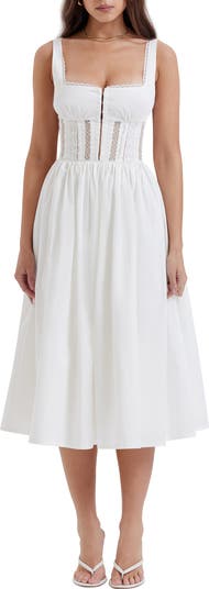 This breezy square-neck sundress features a corseted bodice with lovely lacy trim.