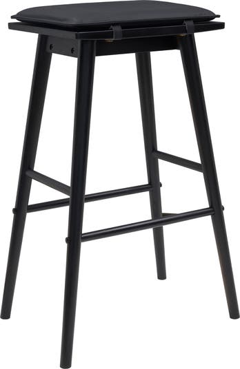 Our mid-century style wooden bar stool features a trim, rectangular saddle seat and angled legs for stability and style. The solid hardwood frame is topped by a tailored vegan leather cushion that can be removed for a more versatile look and easy cleaning. This classic bar stool is perfect for a minimalist kitchen island or farmhouse bar.